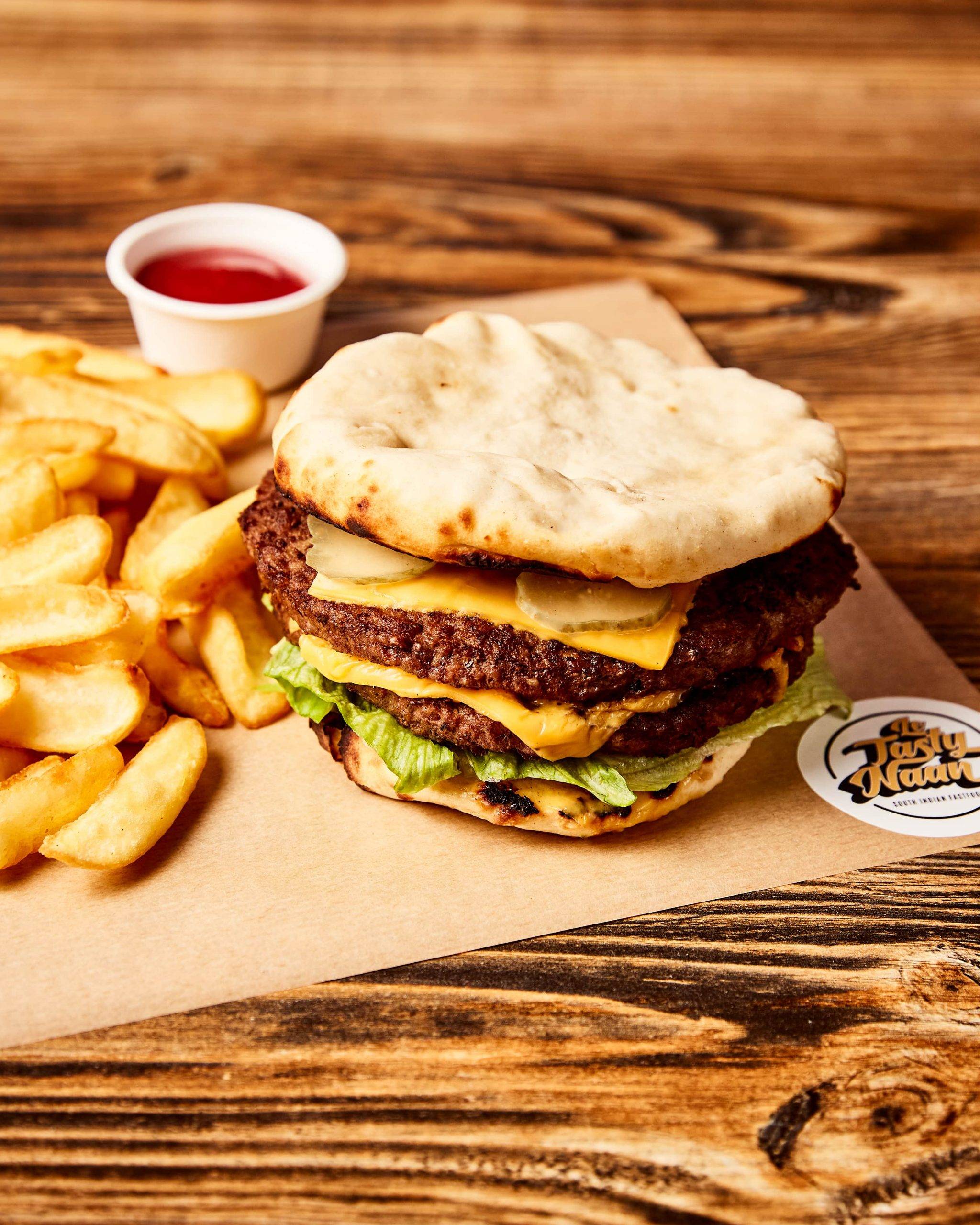 – Des NAAN’BURGERS et NAAN’DWICHS classiques et authentique, à base de naan au fromage fait MAISON.